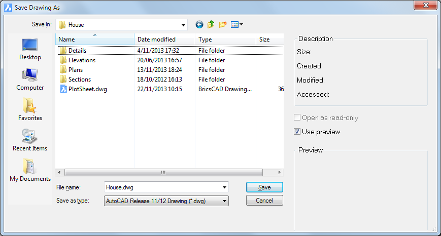 Wählt das Laufwerk und den Ordner aus, in welchem die Zeichnung gespeichert werden soll. Klicken Sie auf die Auswahlliste, um zusätzliche Speicherorte zu wählen. |