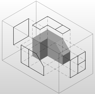 Definiert die Hauptansicht. Dreht das 3D-Modell, so dass die Hauptansicht auf die vertikale Projektionsebene (V.P.) projiziert wird.