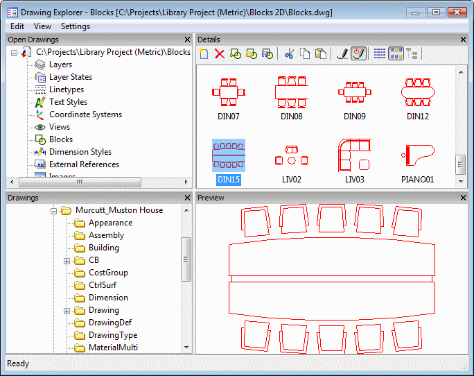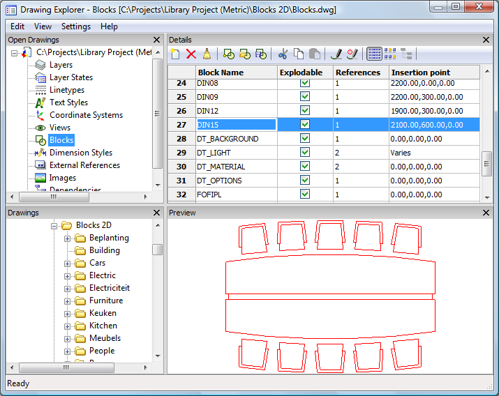 A preview of the selected block displays in the Preview sub-window of the Drawing Explorer.