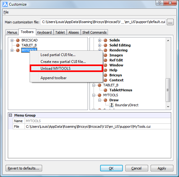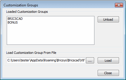 (option) To unload a partial CUI file, select the partial CUI file in the Loaded Customization Groups list, then click the Unload button.