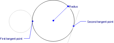 Defines the circle by two points tangent to other entities and the radius; prompts you: Select first tangent point - enter coordinates, or pick an entity. Select second tangent point - enter coordinates, or pick another entity. Radius of circle - specify distance, or pick two points. The abbreviation for this option is RTT. The Tangent entity snap is activated automatically when you are prompted to identify the tangent points. |