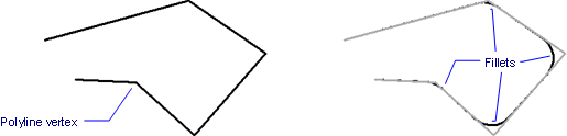 Fillets the vertices of a polyline; prompts you: Select 2D polyline to fillet - choose a single polyline. You cannot control which vertices are filleted; all are. |