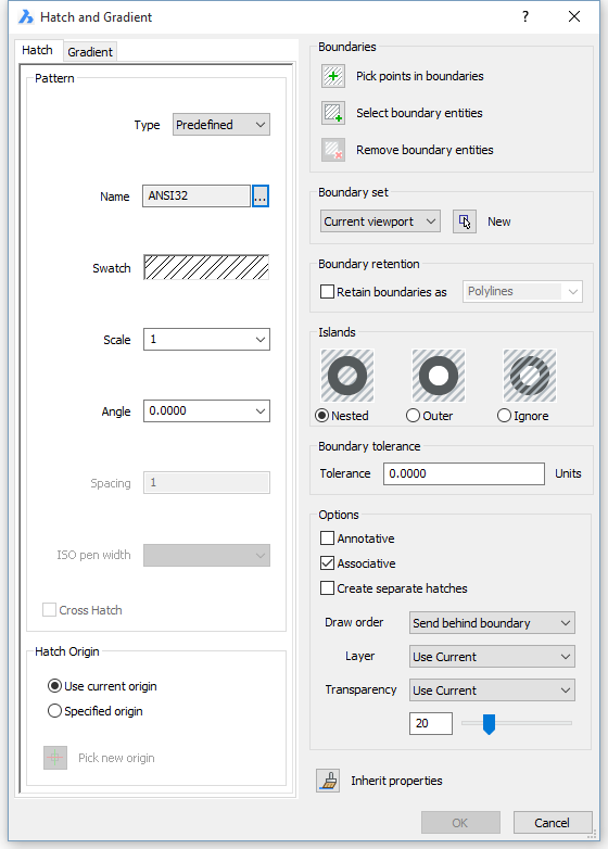 Copies the properties of another, existing hatch pattern; temporarily dismisses the dialog box, and then prompts you at the command bar: Select hatch entity to copy properties from: (Use any selection method to choose a single hatch pattern.) The prompt repeats, allowing you to choose a different hatch entity. When done, press Enter: Select hatch entity to copy properties from: (Press Enter to return to the dialog box.) This button is useful for quickly setting options of a new hatch based on existing hatches. |
