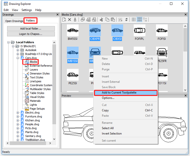 Blocks can be added from the current drawing or from any