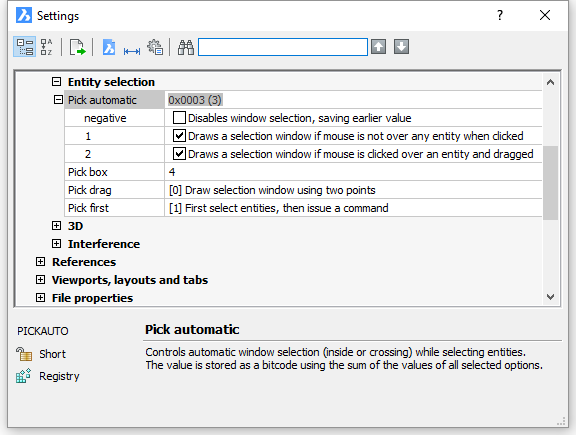 Toggles whether BricsCAD automatically creates window or crossing selections at the 'Select entities' prompt: