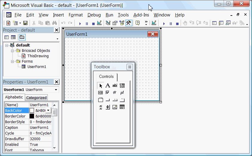 After you have inserted a UserForm, you will generally want to add controls - the buttons, text boxes, and other items contained in your user interface. You place controls by dragging them from the Toolbox onto your UserForm.