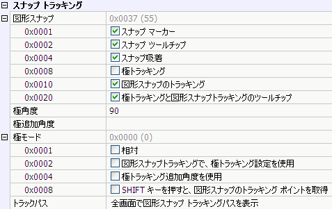図形スナップ> 0x0010: チェックが付いている場合、図形スナップのトラッキングは、オンになります。
