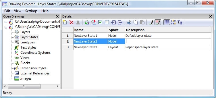 顯示圖層狀態的儲存空間: Model - 儲存在模型空間。 Layout - 儲存在配置空間。 必須在模型或配置頁籤中使用 LayerState 指令。 |