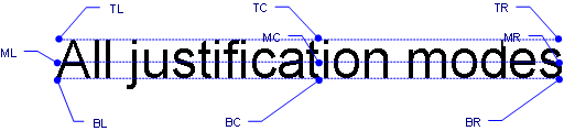 顯示所有對正模式;會提示: 指定文字的起點或 [字型(S)/對齊(A)/佈滿(F)/中心(C)/中央(M)/右(R)/左上(TL)/中上(TC)/右上(TR)/左中(ML)/正中(MC)/右中(MR)/左下(BL)/中下(BC)/右下(BR)] - 輸入選項。